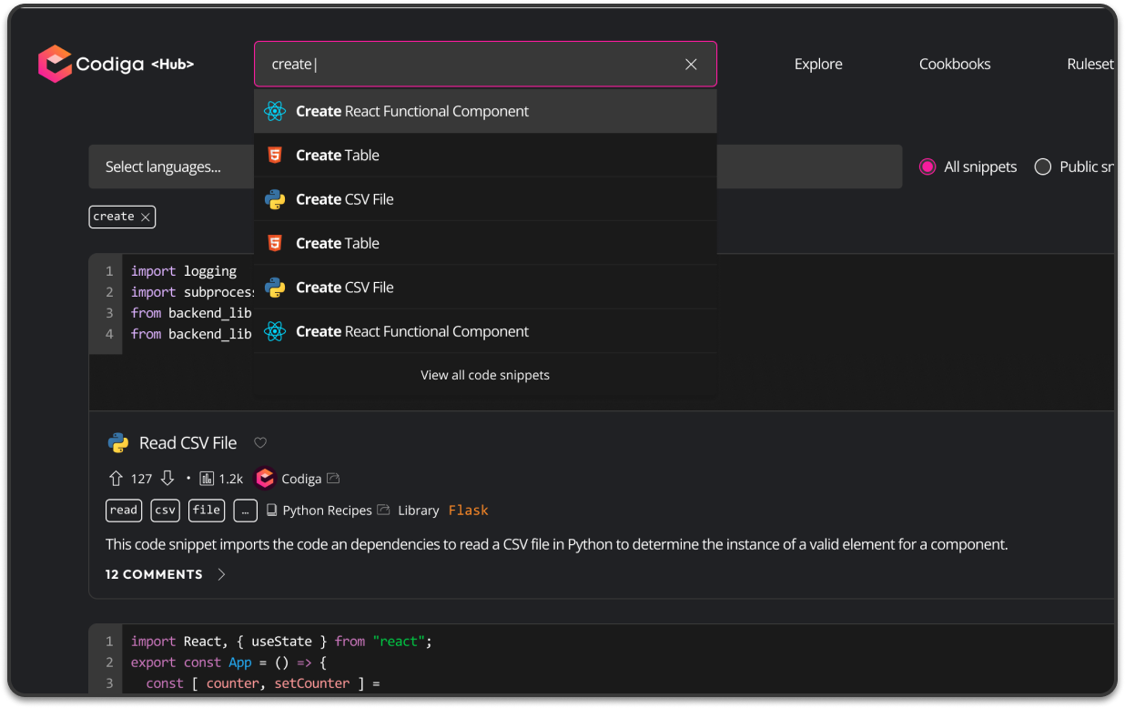 Explore Codiga HubMore than 1.000 code snippets from Codiga’s database