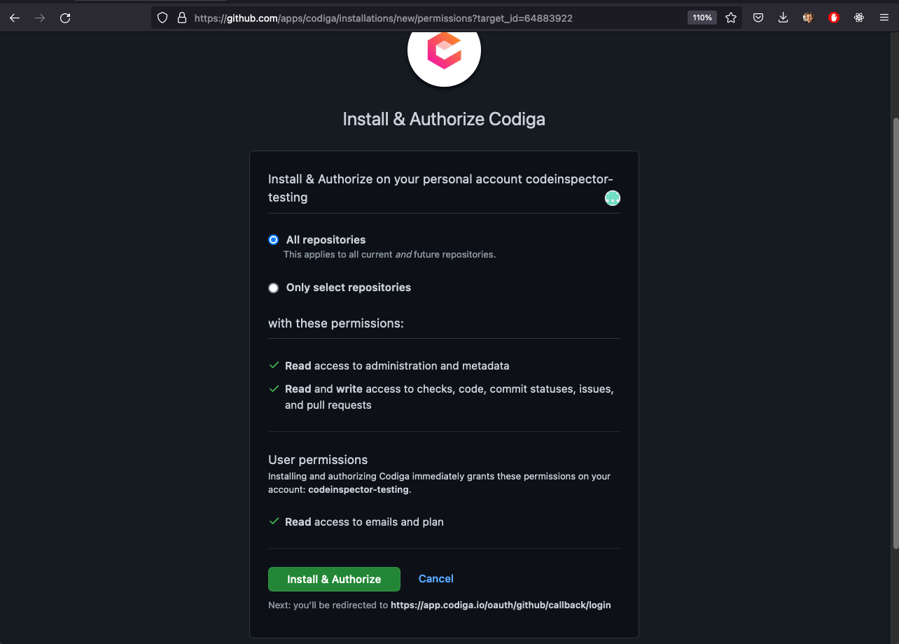 Install the app for your GitHub account or organization clicking on the “Configure” button.